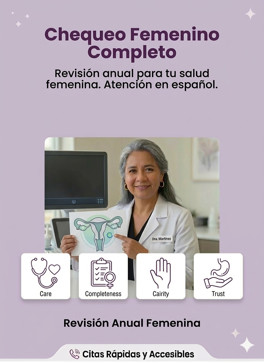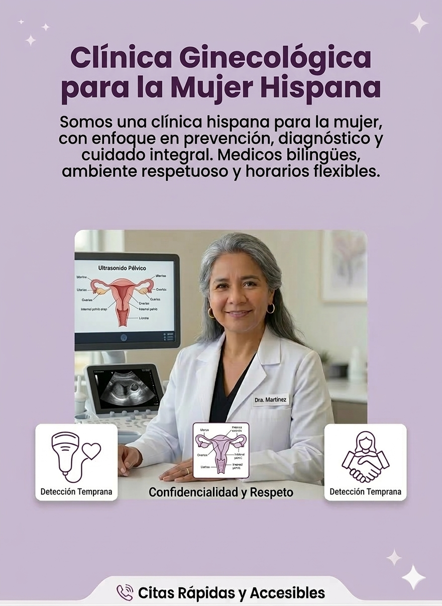 Somos una clínica hispana para la mujer, con enfoque en prevención, diagnóstico y cuidado integral. Ginecólogos bilingües, ambiente respetuoso y horarios flexibles.