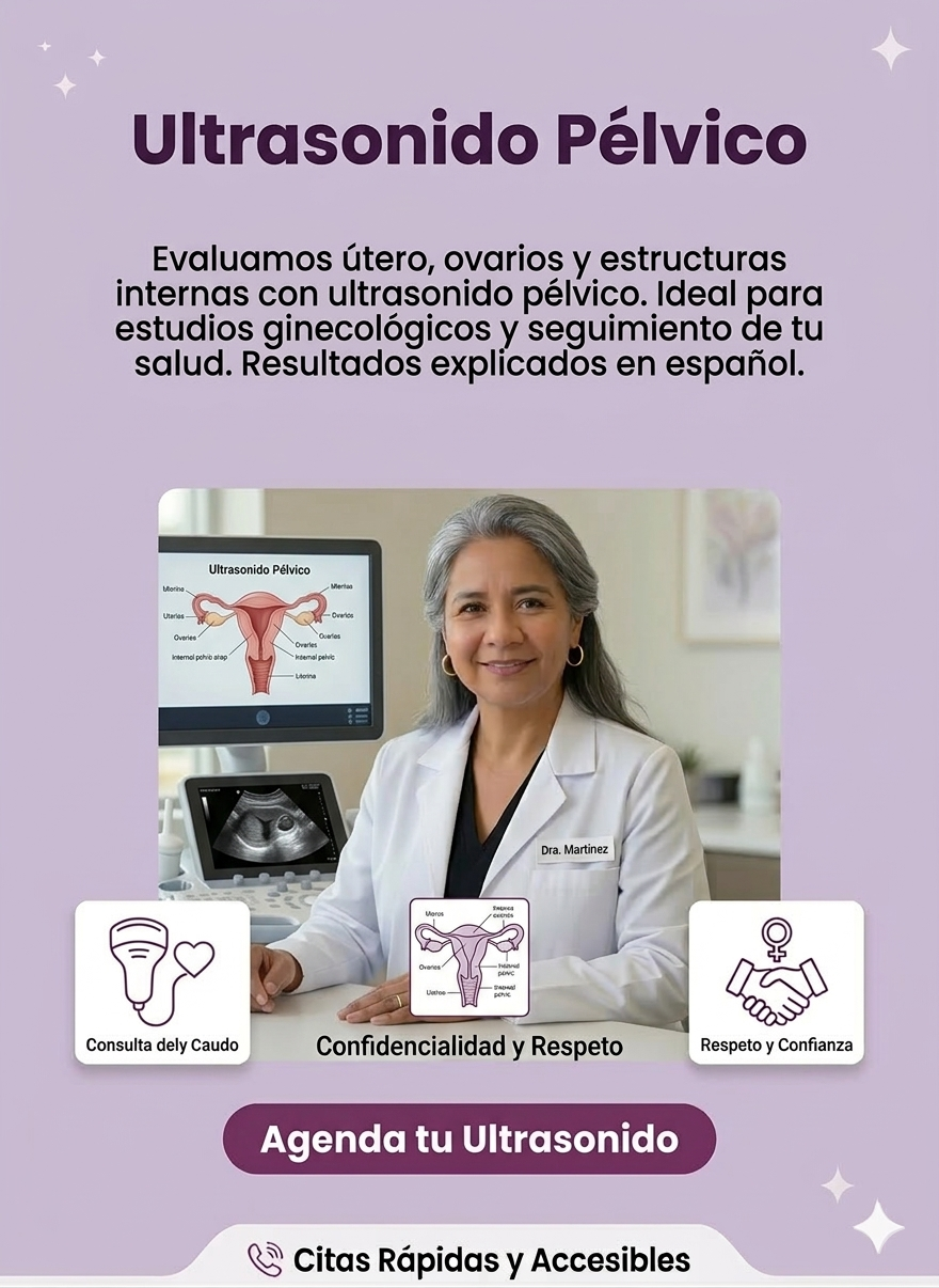 Evaluamos útero, ovarios y estructuras internas con ultrasonido pélvico. Ideal para estudios ginecológicos y seguimiento de tu salud. Resultados explicados en español.