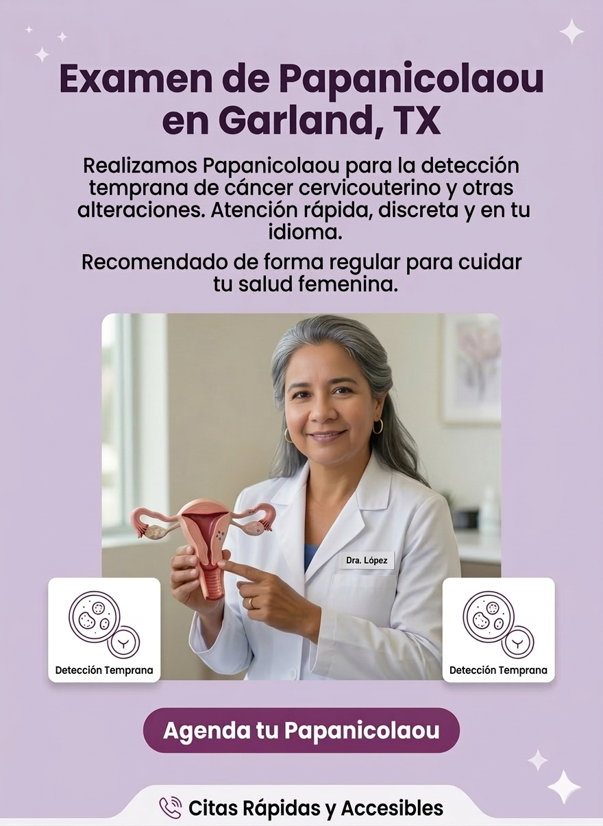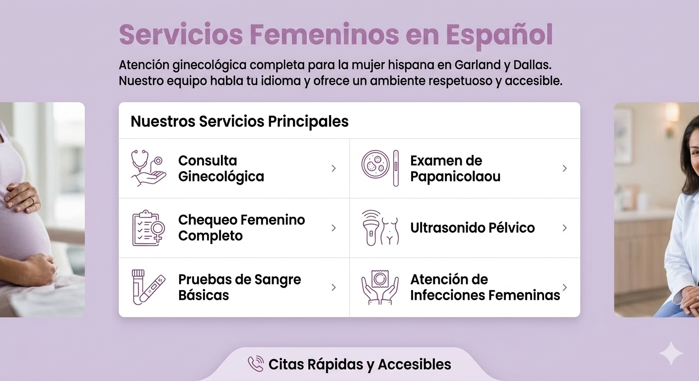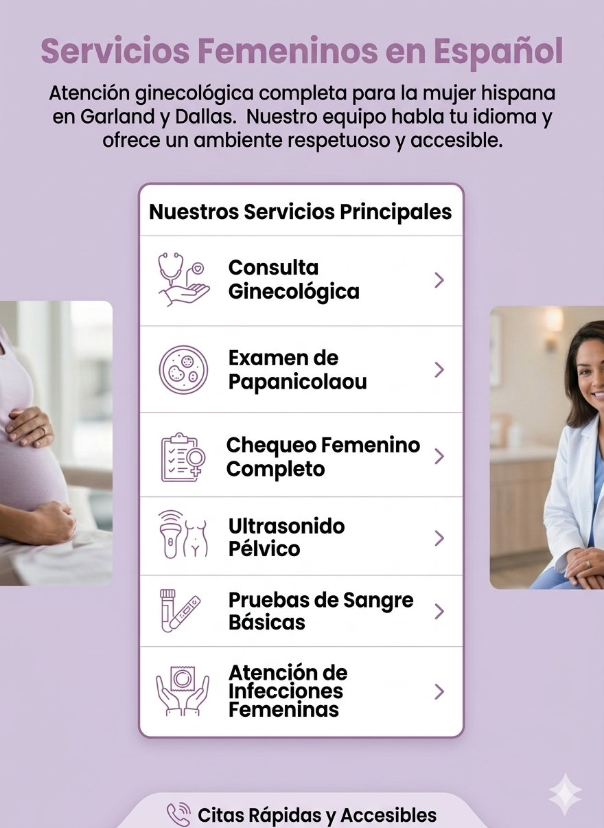 Atención ginecológica completa para la mujer hispana en Garland y Dallas. Nuestro equipo habla tu idioma y ofrece un ambiente respetuoso y accesible.