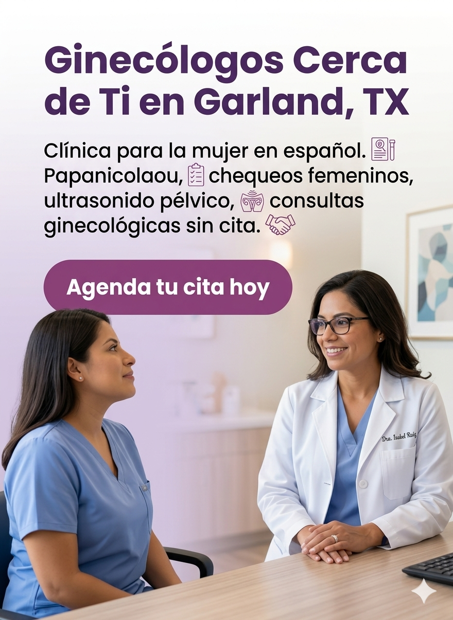 Si buscas “ginecólogos cerca de mí” o “ginecólogo que hable español”, estás en el lugar correcto. Atendemos pacientes de Garland, Dallas y alrededores.