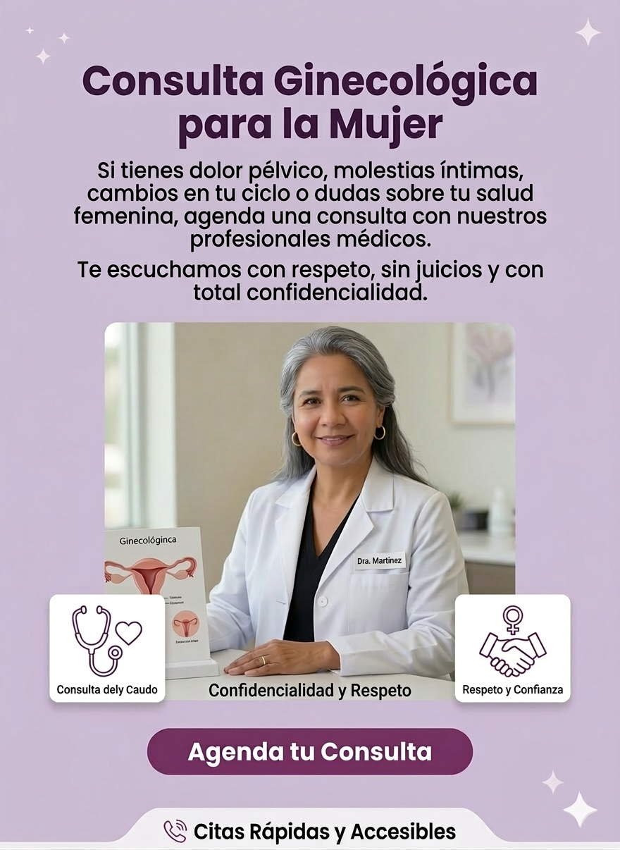 Si tienes dolor pélvico, molestias íntimas, cambios en tu ciclo o dudas sobre tu salud femenina, agenda una consulta con nuestros ginecólogos. Te escuchamos con respeto, sin juicios y con total confidencialidad.